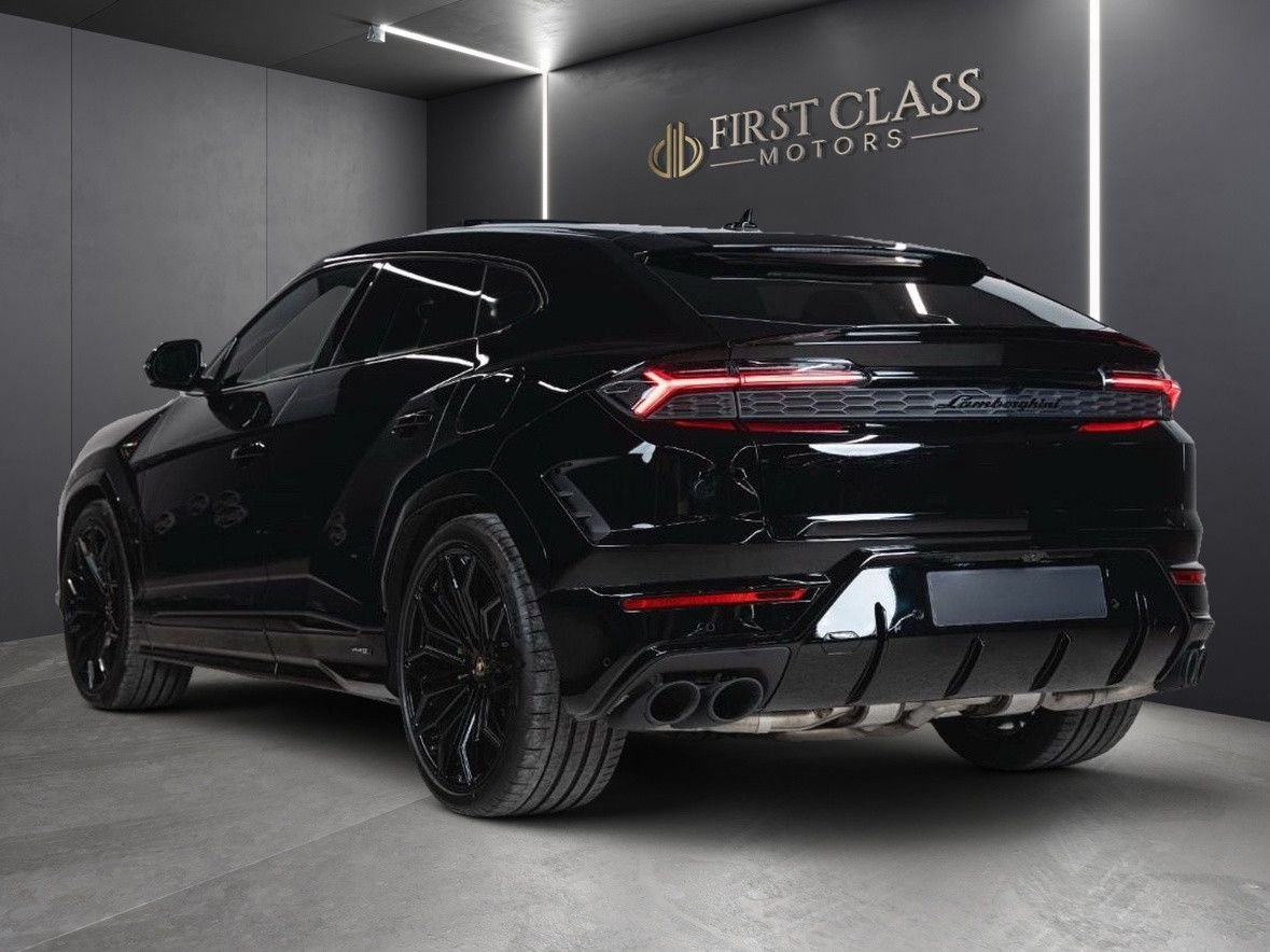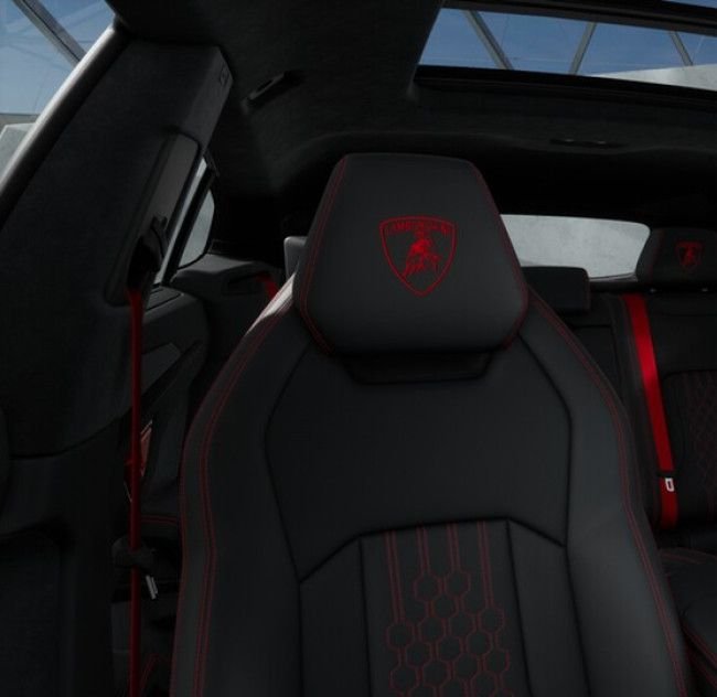 Rear Seat Entertainment, Carbon-Interieurpaket, Ambiente-Lichtpaket, Spiegelgehäuse in glänzendem Carbonfaser, Fußmatten mit Ledereinfassung und Doppelnaht, Schwellerleiste aus Carbonfaser, Sunblinds -Paket, In die Kopfstützen gesticktes Lamborghini-Schild, Style-Komplettpaket in Hochglanz-Schwarz, Einsätze aus schwarz eloxiertem und gebürstetem Aluminium, Unicolor leder mit Kontrastnähten, Rote Bremssättel, Innentürgriffe Rosso Efesto, Dark Package, Panoramadach, Rückseite Lamborghini Logo matt schwarz, 23''-Felgen Galanthus, Schwarz glänzend, Vollständig elektrisch einstellbare Vordersitze mit Belüftung und Massage, Sitze aus Leder mit Performante Trim, Sportlenkrad aus Corsa Tex mit roter Markierung, dunkler Blende und X-Nähten, Mattschwarze Endrohre, Advanced 3D Bang & Olufsen Soundsy, Parkassistenzpaket mit Remote Park Assist, Schall